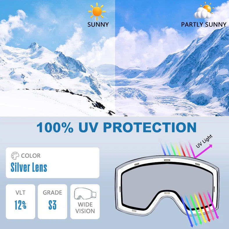 SNØK Glacier Goggles är utrustade med UV400-linser, vilket innebär att de blockerar 100 % av både UVA- och UVB-strålar. På höga höjder där solen är som starkast kan du lita på att dina ögon alltid är helt skyddade.
